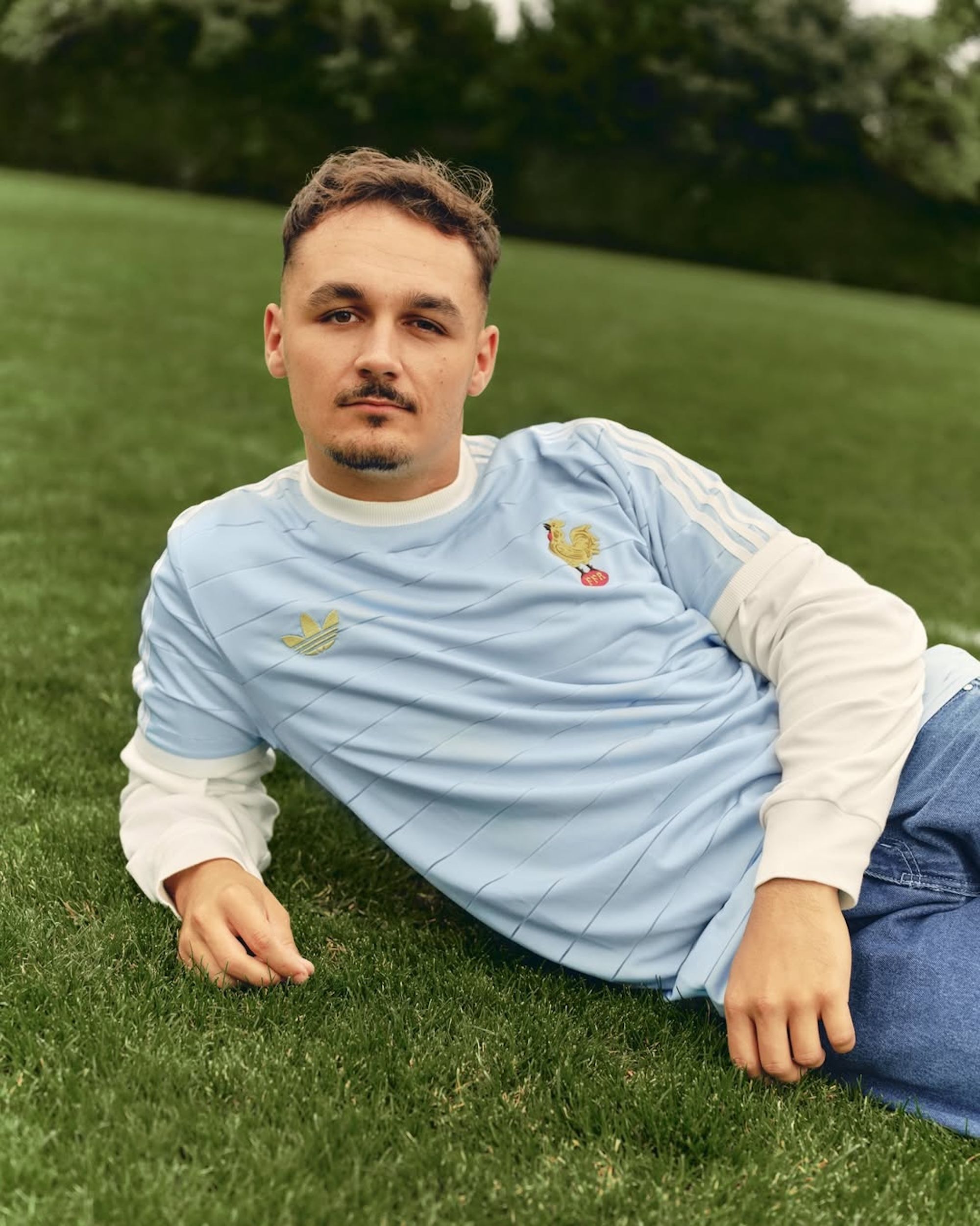Drawing inspiration from the squad's kit from 1906, the capsule sees "Clear Sky" and "Off White" finishes across a French terry jersey and shorts set, acrylic cardigan, and twill cargo pants. A Trefoil logo and French Rugby Federation (FFR) emblem share real estate across the front of all items, with both branding elements opting for elegant gold presentations.