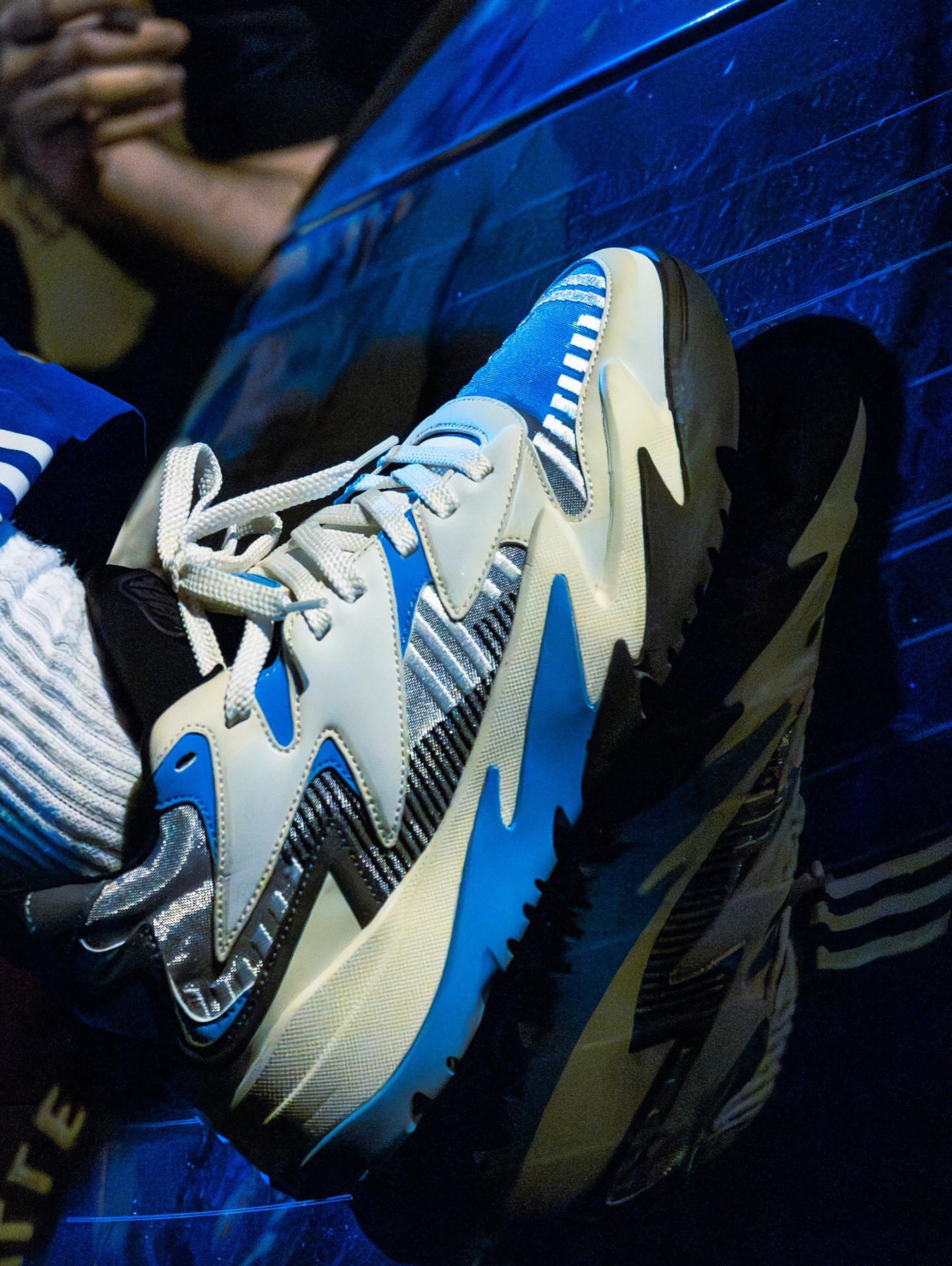 J. Cole's Indie 5000 sneaker, produced in Italy, in a white, blue, and black color scheme.