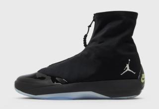 Next in the spotlight is the Air Jordan 40/28, which channels the distinctive design language of the Air Jordan XX8. The most recognizable feature is the fold-down zippered shroud covering the upper, mirroring the 2013 model's signature look. When unzipped, the interior reveals stylized “2” and “3” numerals on the inner flaps — a direct nod to the original XX8’s layered design — while a bright volt-green interior echoes the launch colorway that introduced the silhouette over a decade ago.