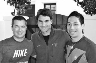“Note”Tate Kuerbis with Roger Federer and Alexander Chan, former Product Line Manager at Nike. Photo via Kuerbis.