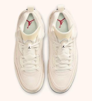 Premium sail-colored suede takes over the upper, immediately shifting the Spizike’s usual attitude. The plush material wraps the toe, eyestays, and midfoot panels, while subtle tonal variations help keep the monochrome palette from feeling flat. Underfoot, an off-white midsole reinforces the clean aesthetic, broken up only by hits of black and University Red along the outsole for a familiar Jordan finish.