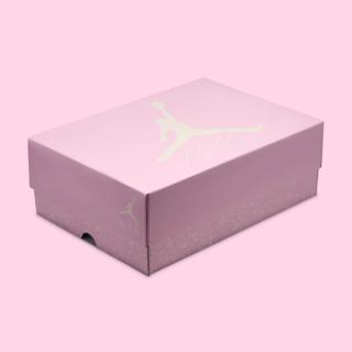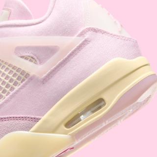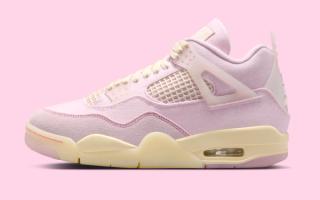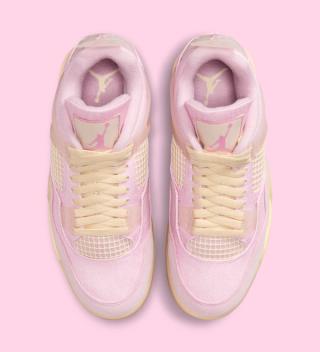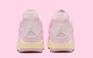 Underfoot, the Women’s Air Jordan 4 “Iced Carmine” sits atop a muted yellow-tinted midsole with visible Air cushioning in the heel. A translucent outsole with soft pink traction zones completes the build. The shoe also comes housed in a matching pink box with subtle speckle detailing along the base.