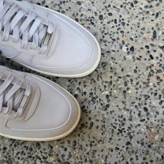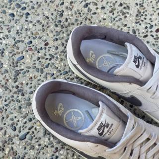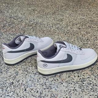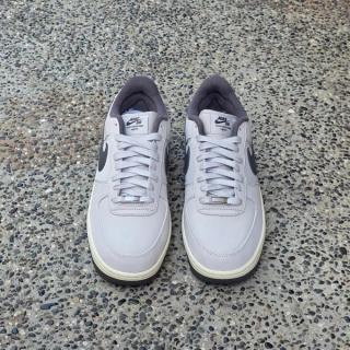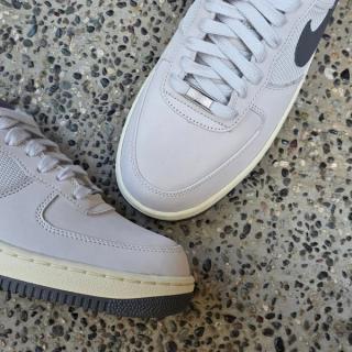 The sneaker features a mix of smooth leather and mesh across the upper, dressed primarily in light grey tones. Darker “Iron Grey” accents land on the Swoosh, lining, and outsole, providing subtle contrast while maintaining the shoe’s muted appearance. A slightly aged midsole adds a vintage touch, reinforcing the connection to the Air Force 1’s early-era styling.
