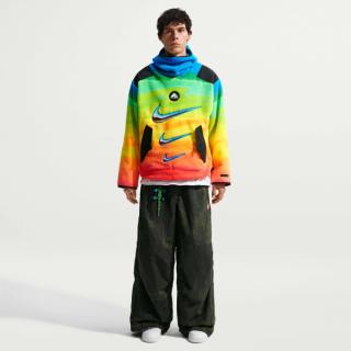 The fleece-heavy silhouettes on display feel intentionally loud, with psychedelic gradient dyes, oversized proportions, and an abundance of Swooshes scattered across the surface. The standout 'Baklava' hoodie layers neon greens, blues, oranges, and pinks in a washed, almost heat-map effect, finished with multiple embroidered Swooshes and bold graphic placements that feel more art installation than activewear. Another piece opts for a more restrained palette, but still carries CPFM’s unmistakable fingerprints through playful graphics, asymmetrical detailing, and tactile embellishments that elevate simple fleece into statement gear.