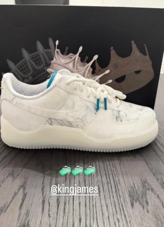 "White Marble" Nike Air Force 1 for LeBron James, featuring a crown-shaped sole unit and goat logos.
