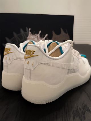 Premium materials are used throughout the pair, which features a crown-shaped, semi-translucent sole unit that references both James' current Nike Basketball signature model and one of his earliest logo treatments. A quilted lining and "Metallic Gold" accents appear on the Air Force 1, further indulging in a luxe makeover.
