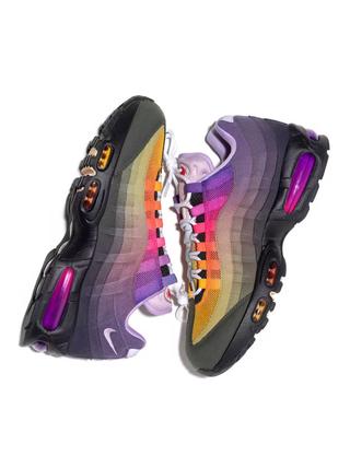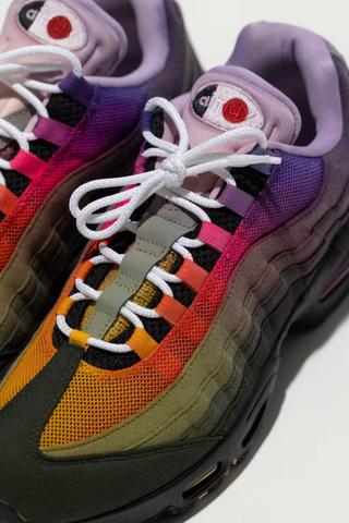 Designed by London-based artist Lorenzo G Federici, the pair reflects his long-standing focus on turning sneakers into wearable art. This Air Max 95 features a gradient upper that transitions through soft purples, pinks, and darker tones, paired with a black midsole. The finish aligns with his signature style, where each piece is treated as a unique, handcrafted work.