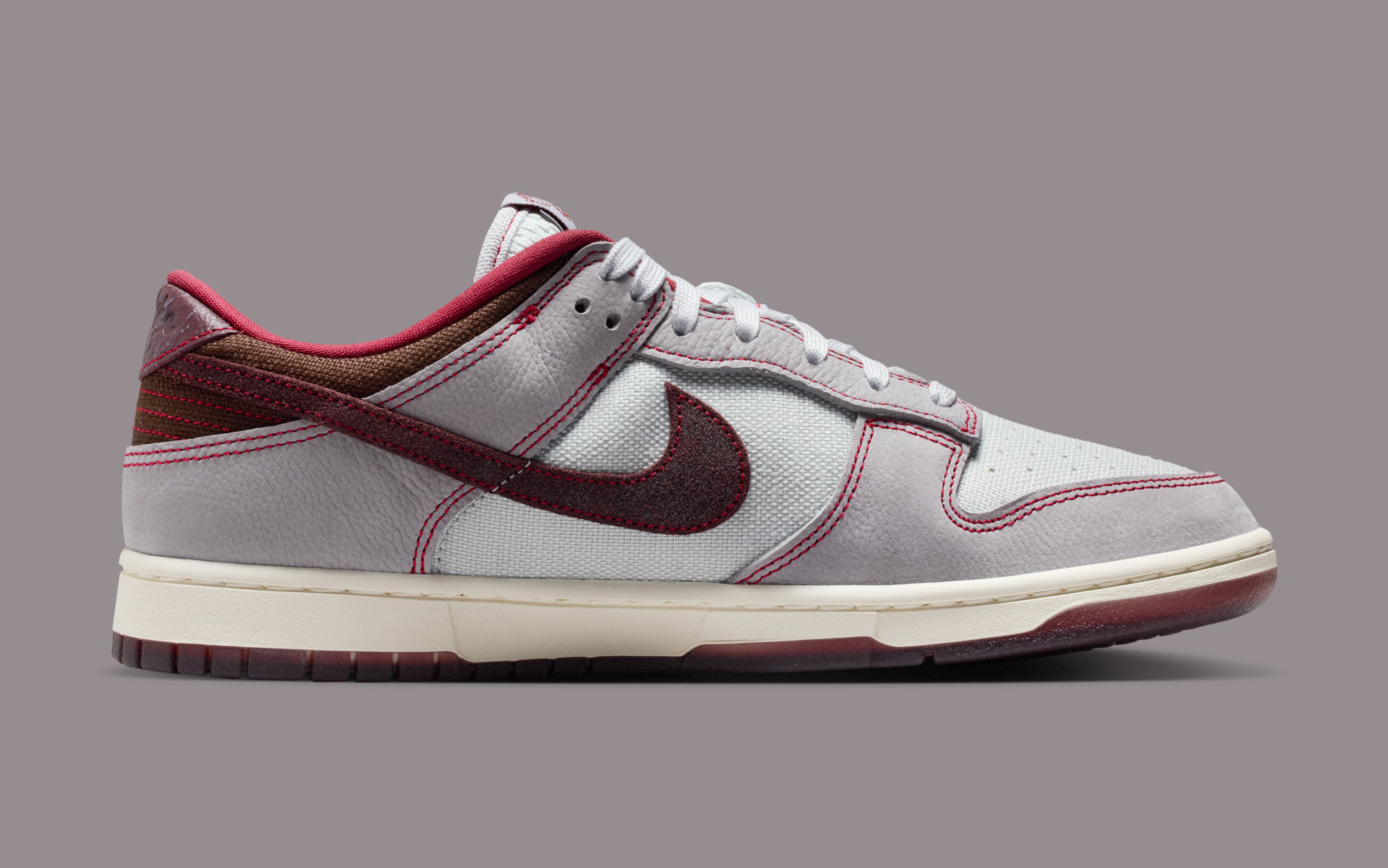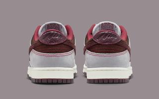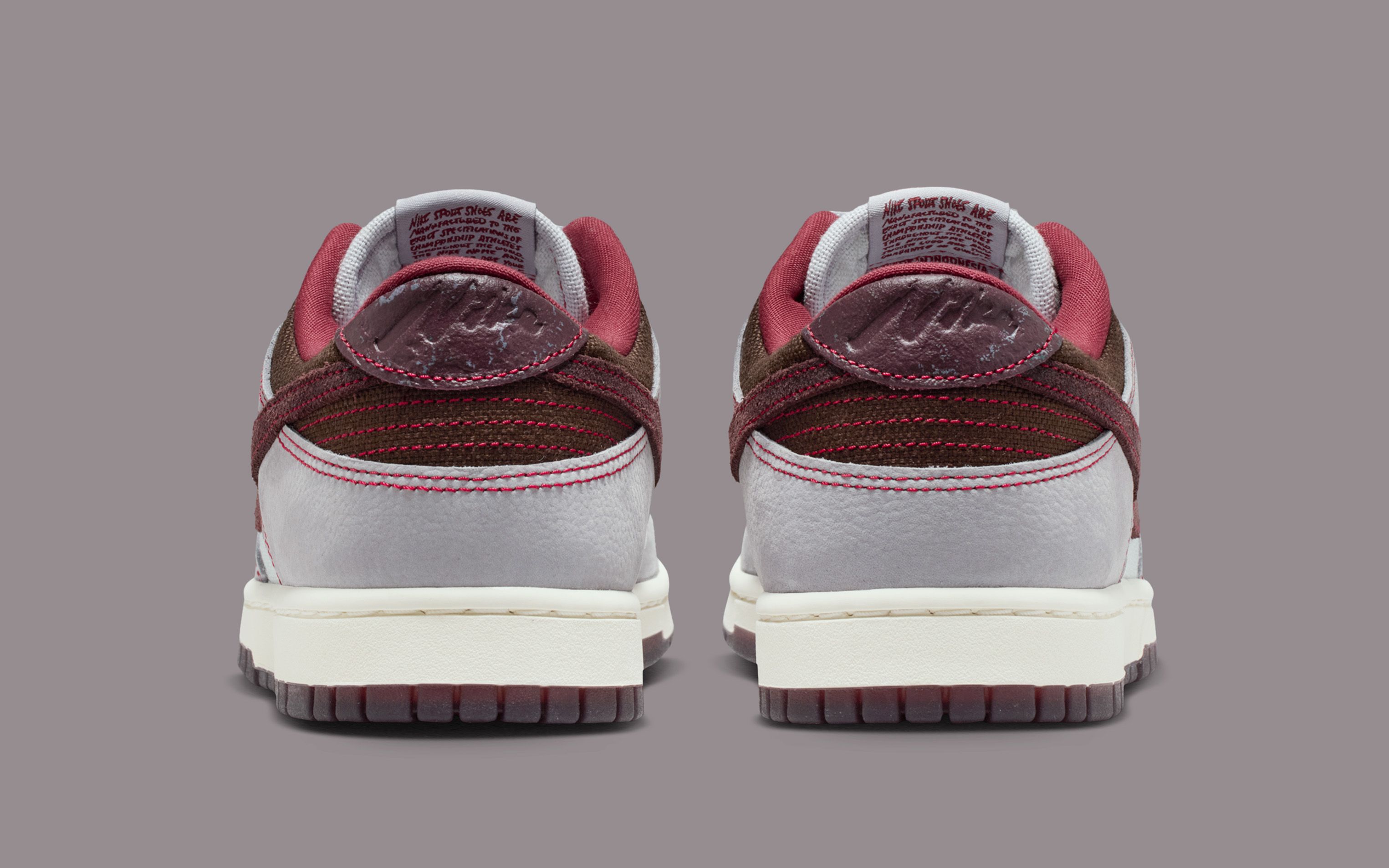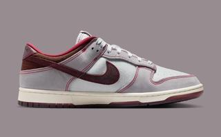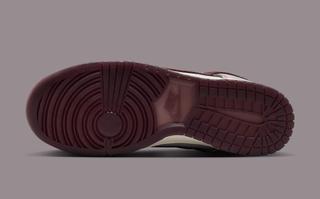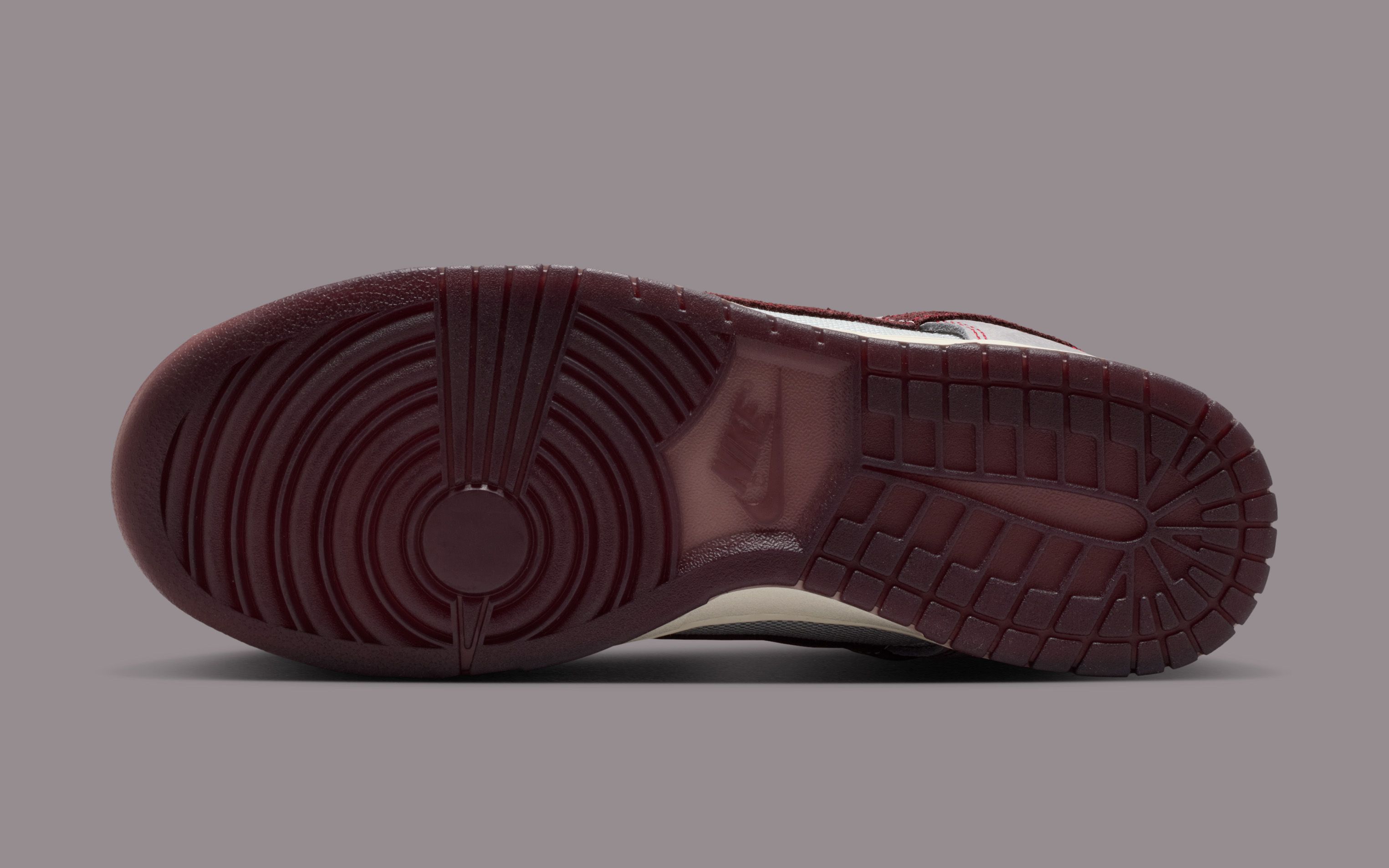 Underfoot, the design stays true to the Dunk’s roots with a standard cupsole construction, finished in a slightly aged midsole that complements the upper’s vintage-leaning aesthetic. The outsole features a translucent burgundy finish, tying back to the Swoosh and heel details.