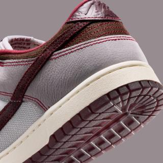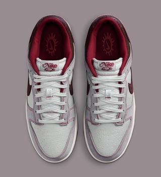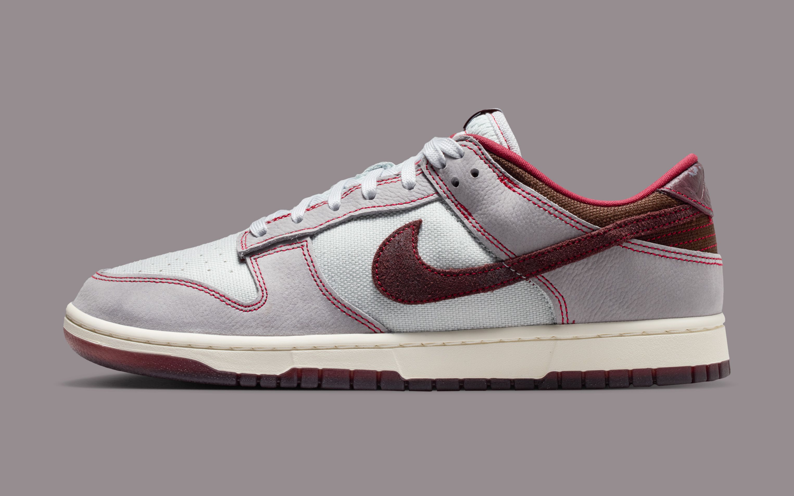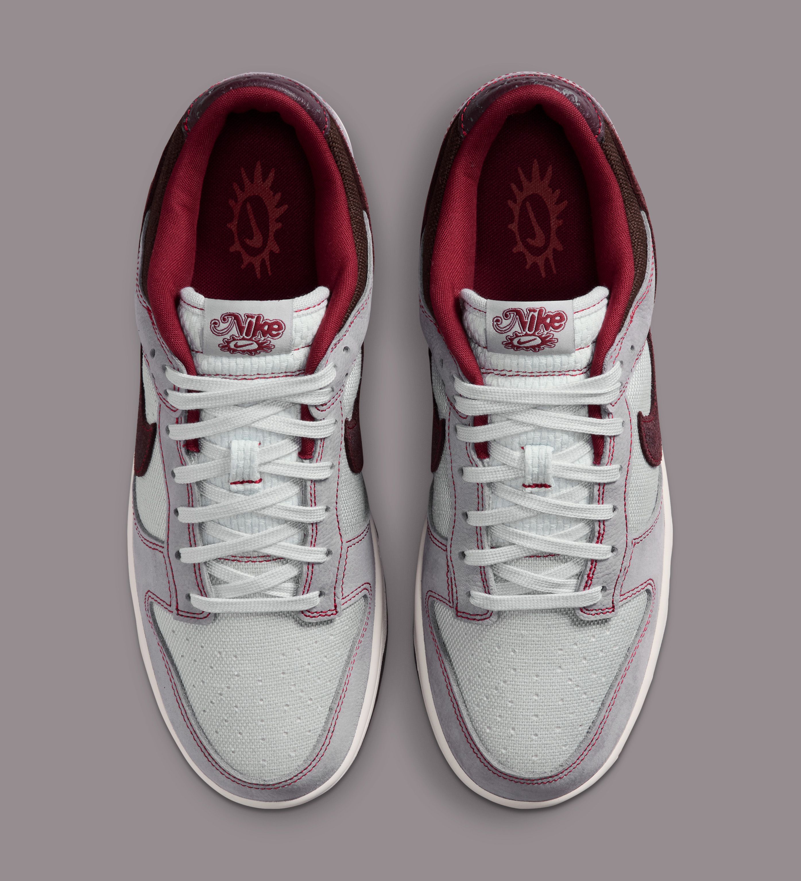 Underfoot, the design stays true to the Dunk’s roots with a standard cupsole construction, finished in a slightly aged midsole that complements the upper’s vintage-leaning aesthetic. The outsole features a translucent burgundy finish, tying back to the Swoosh and heel details.