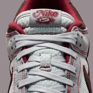 Up top, the tongue stands out as one of the pair’s more distinctive features. A woven canvas base is paired with retro-inspired Nike branding, echoing hand-drawn, skate-era graphics that reinforce the shoe’s casual positioning. The interior lining arrives in a muted red tone, adding depth without disrupting the palette, while layered materials throughout give the pair a worn-in, almost archival feel.