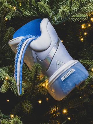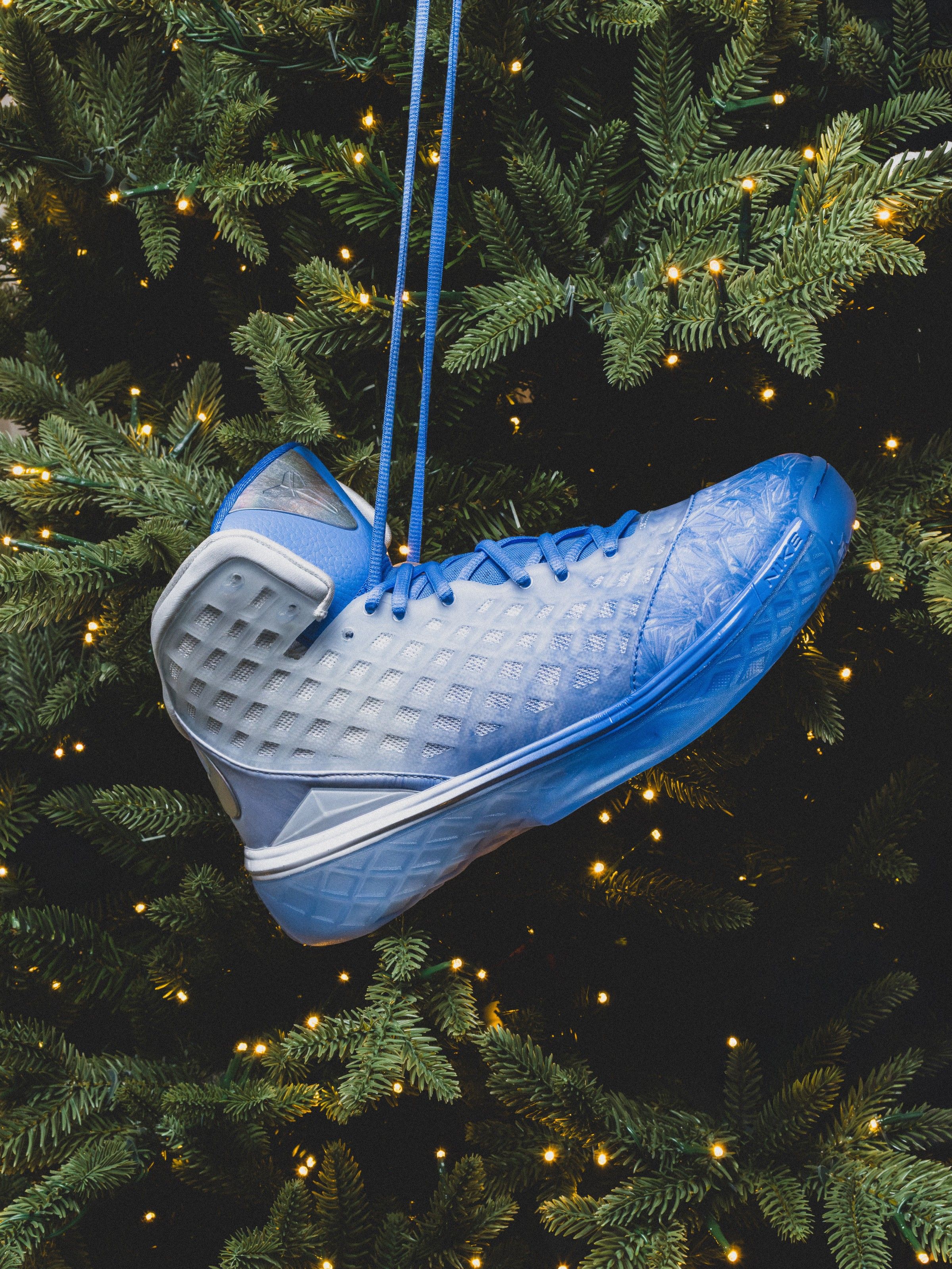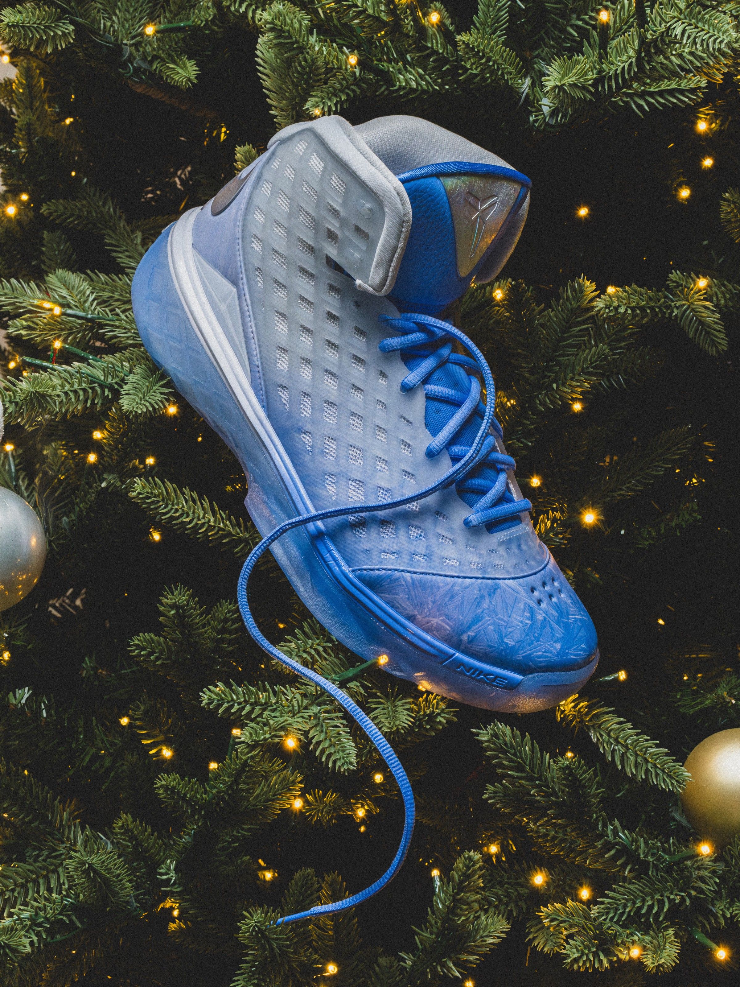 Originally worn by Bryant on court in December 2008, the Kobe 3 “Christmas” was a bold departure in design, showcasing the model’s unique web-like upper dressed in a bright blue base with icy accents. For 2025, the colorway returns in Protro form, modernized with updated cushioning and construction to meet today’s performance standards. The upper features its signature translucent cage overlay, now sitting atop a Zoom Air-loaded midsole and improved traction system for increased responsiveness on the hardwood.