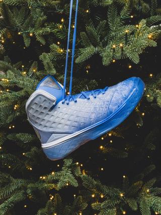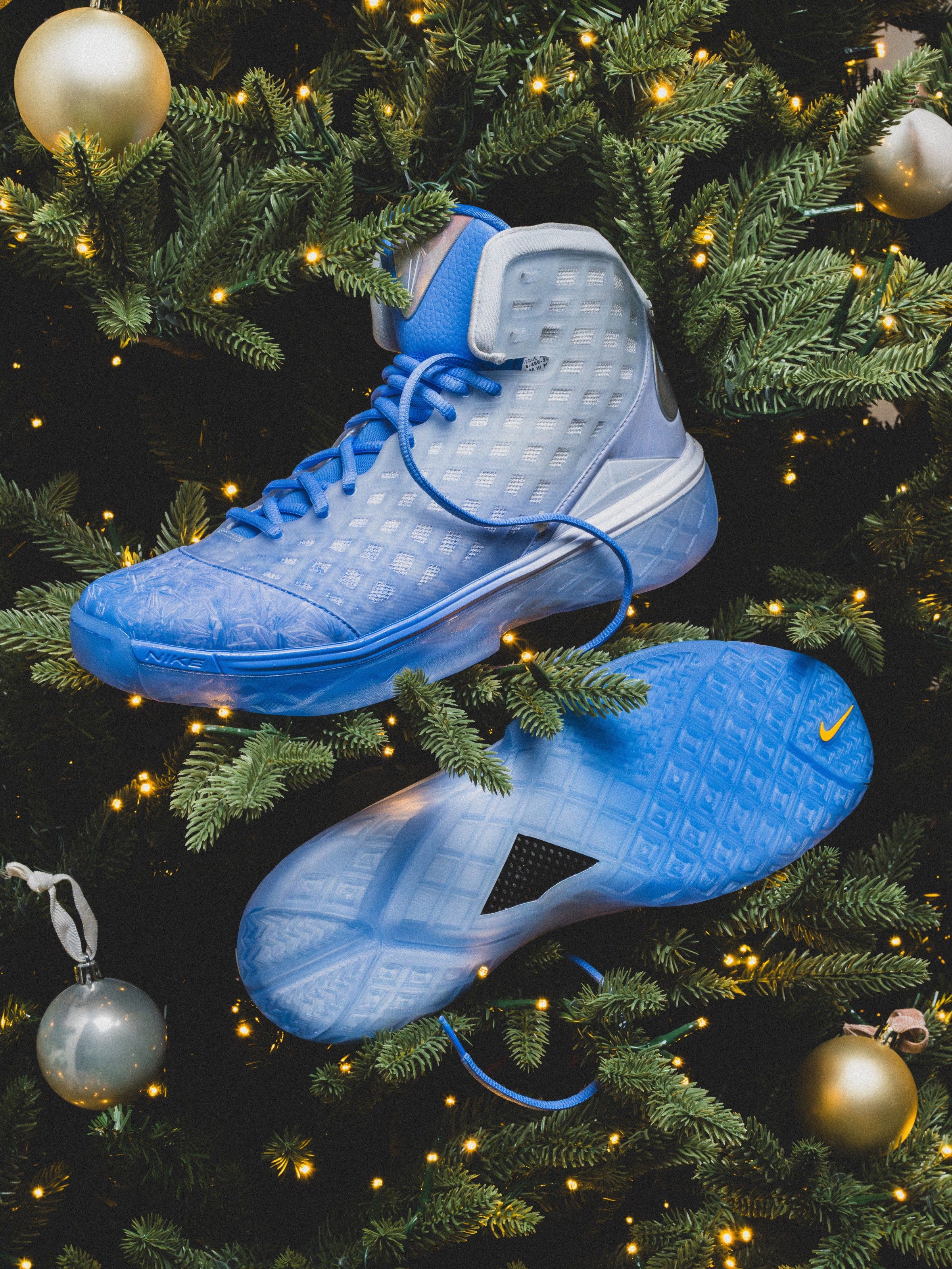 The pair balances festive flair with icy cool tones, highlighted by a mix of glacier blue mesh and iridescent detailing across the Swoosh and tongue logo. A frosted outsole completes the look, tying into the wintry theme that made this edition a standout during its original release.
