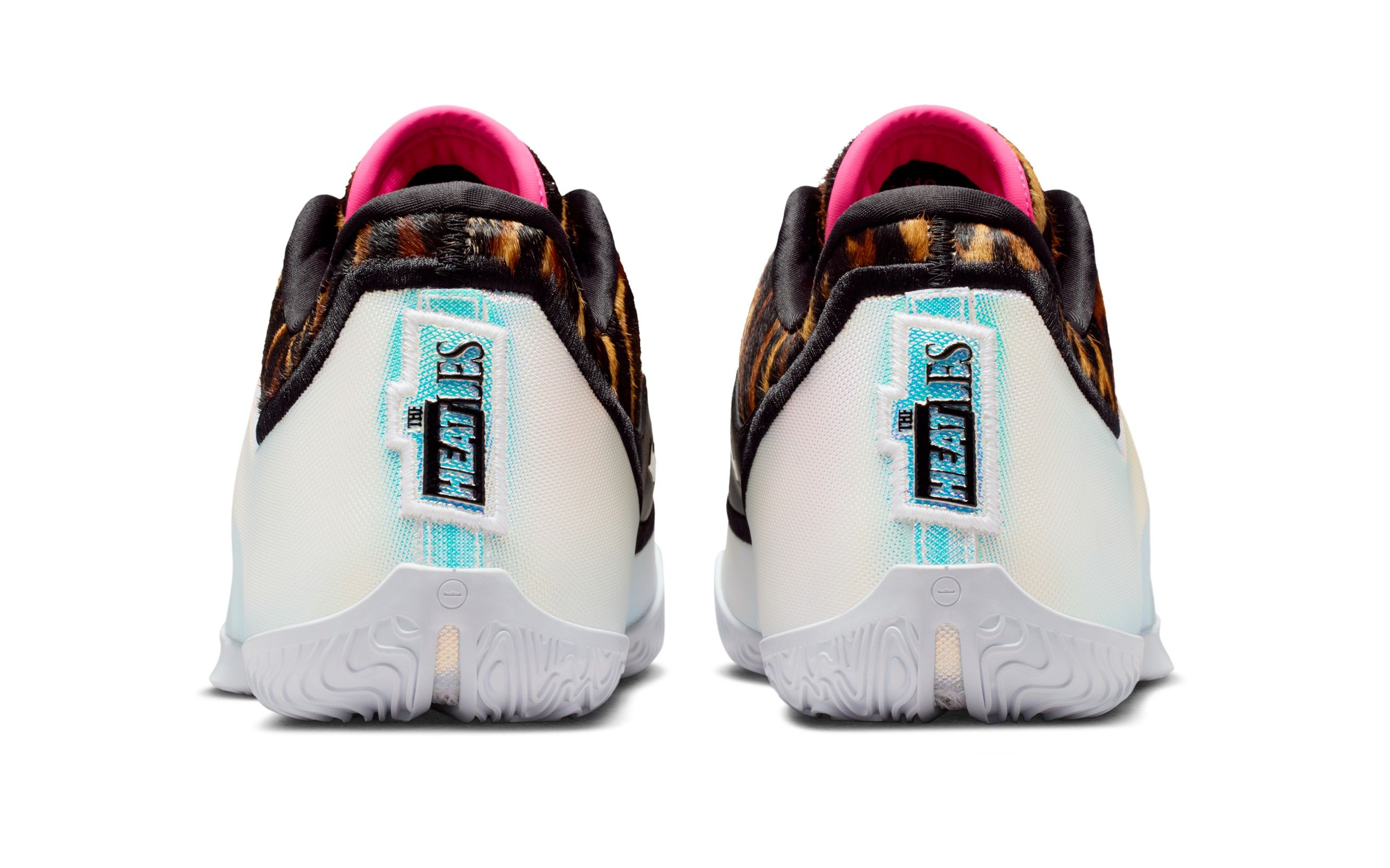 The LeBron 23 continues the low-cut direction introduced earlier in the model’s rollout, applying a blend of performance innovation and lifestyle-friendly styling. For this release, Nike layers the upper in a striking combination of iridescent gradients and faux-animal textures. A teal-to-pearl fade wraps the lateral panels, contrasted against a tiger-striped treatment through the collar and eyestay—an unmistakable nod to the loud, confident energy Miami embodied during the Big Three era.