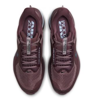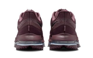 The upper blends open-knit mesh with ripstop segments and smooth synthetic overlays, creating a textured base that plays beautifully with the deep burgundy palette. Shifts in pattern density across the toebox and midfoot evoke a sense of gradient shading, while the wavy midfoot overlay cuts across the design like a clean line of ink. Under the right light, the glossy Swoosh adds dimension with its darker, almost charcoal-blue tint, enhancing the impression of layered markings.