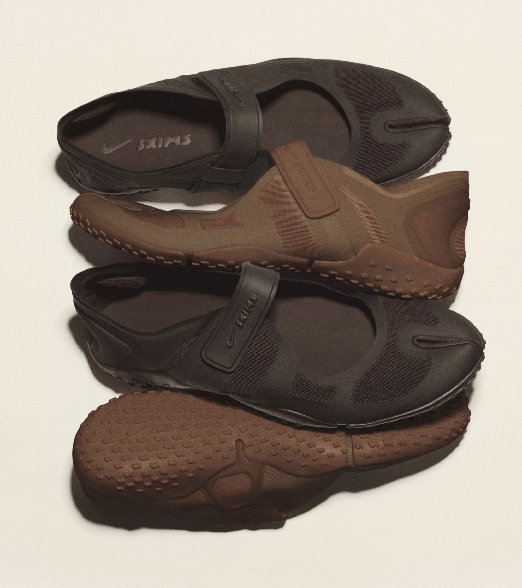 The debut NikeSKIMS footwear collection begins rolling out on Monday, Jan. 26. Mesh pairs in "Black," "Velvet Brown," and "Archaeo Brown" will release through SKIMS.com, Nike SNKRS, and select retailers.