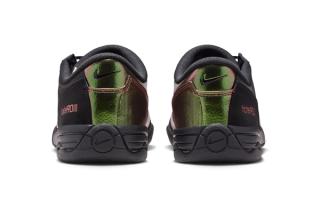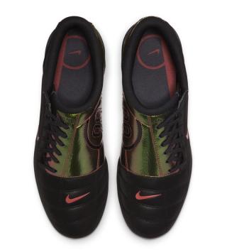 Recently, the football boot's indoor-variant emerged in an all-new "Black/Red Sepia" makeover. The pair opts for a predominantly dark finish that sets the stage for shimmering contrast across the tongue, branding elements, and medial profile. These aforementioned components introduce metallic-like finishes into the mix, with the spine and 90-branded paneling on the instep shifting colors from a copper-reminiscent tone to a green one à la original Air Tuned Max launch.